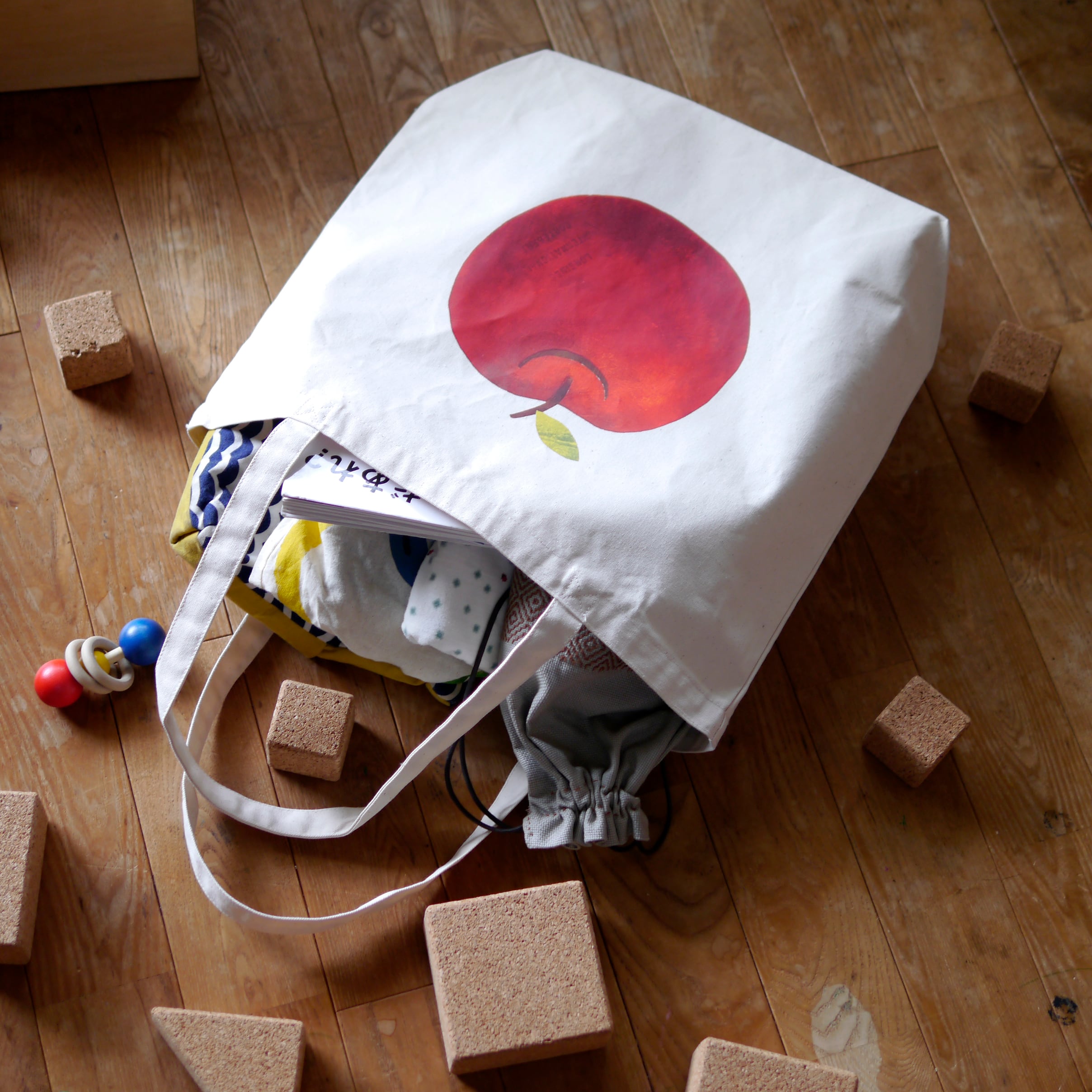 古紙や古本などの素材を使ってコラージュで描かれた作品は、ファブリックとの相性も良く素敵な仕上がりに。背面には、WHO EATS?(たべるのだあれ?)の文字とマスコットの「ねずみ」がデザインされています。