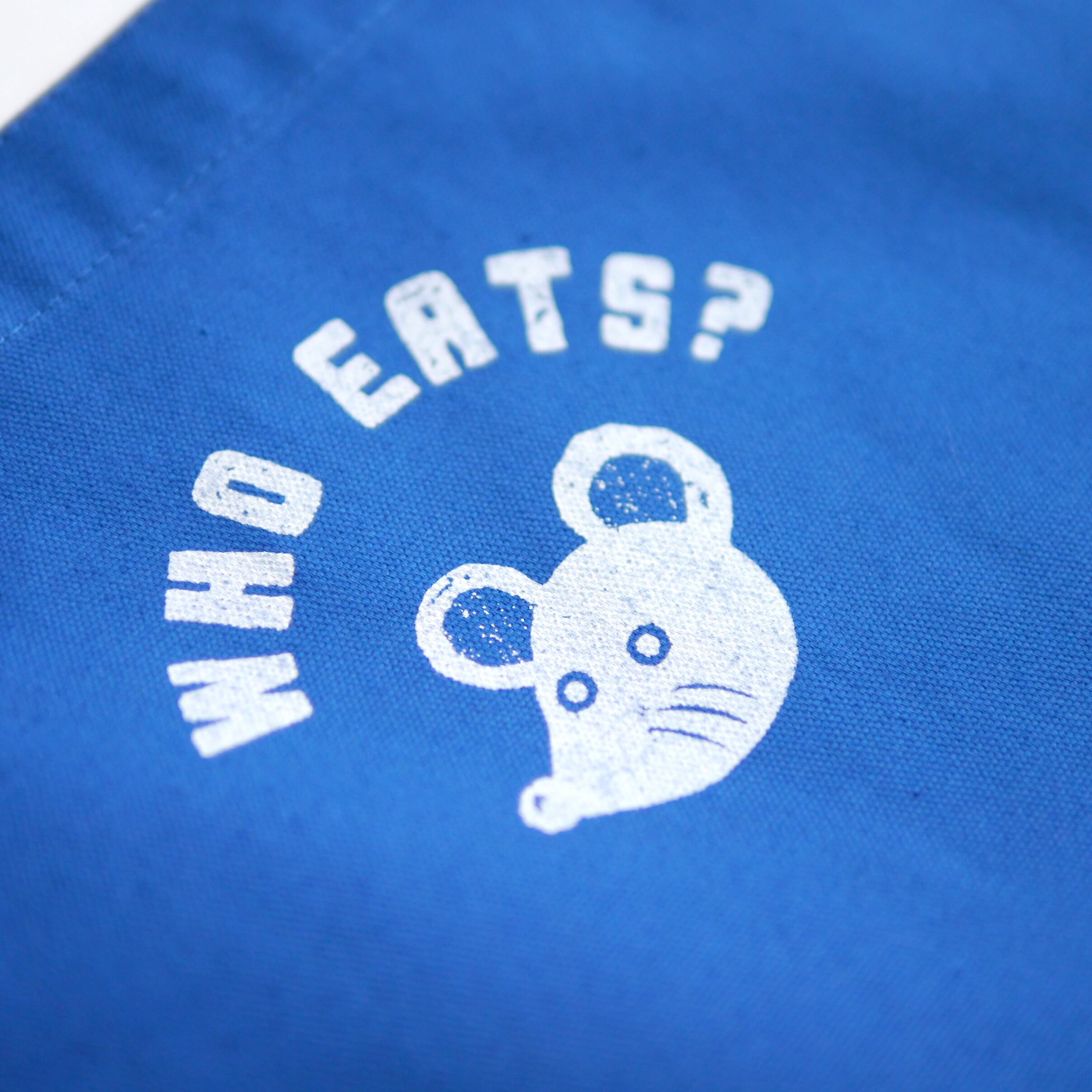 古紙や古本などの素材を使ってコラージュで描かれた作品は、ファブリックとの相性も良く素敵な仕上がりに。背面には、WHO EATS?(たべるのだあれ?)の文字とマスコットの「ねずみ」がデザインされています。