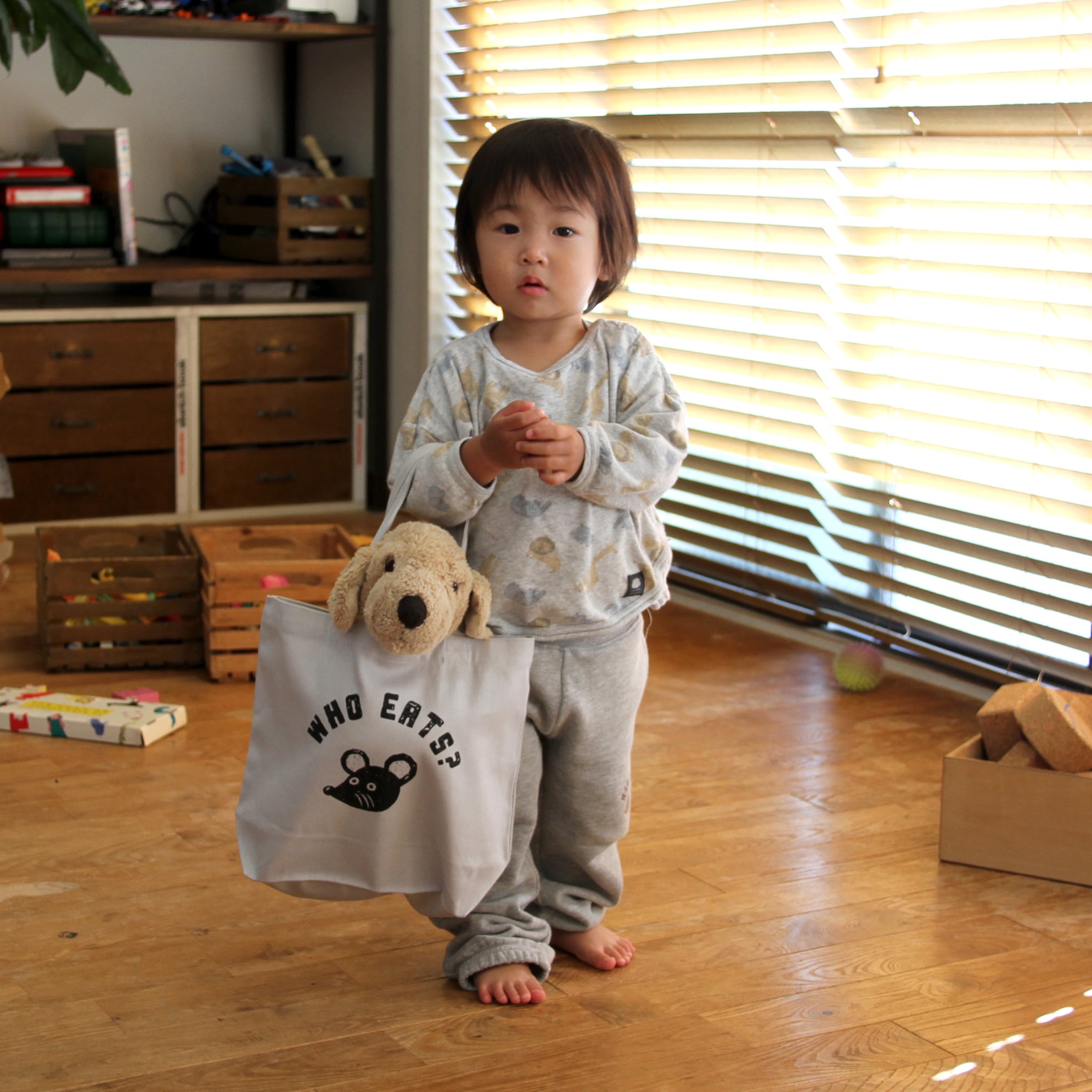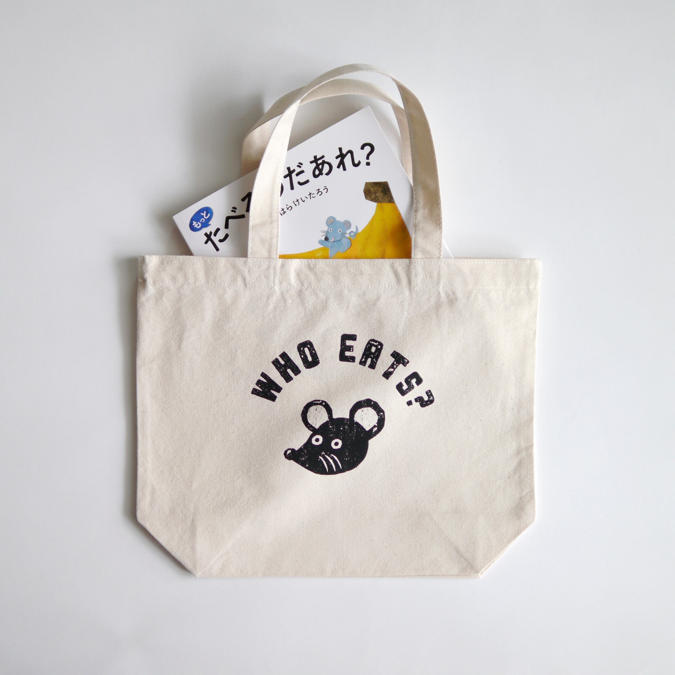 トートバッグには、WHO EATS?(たべるのだあれ?)の文字とマスコットの「ねずみ」をプリント。生地の風合いを損ねず古着のような風合いが表現できる半ラバープリントを施した、アパレルライクな仕上がりです。