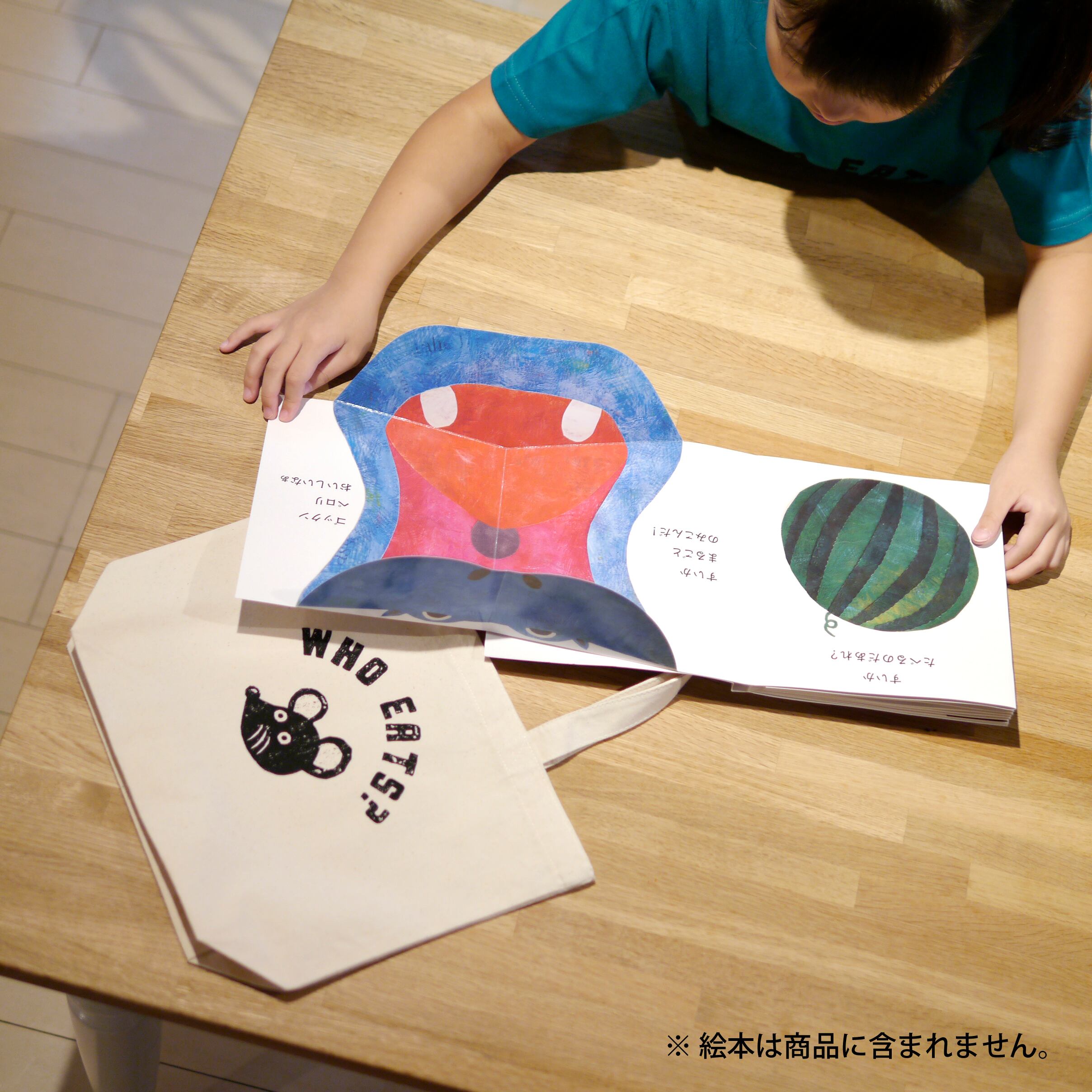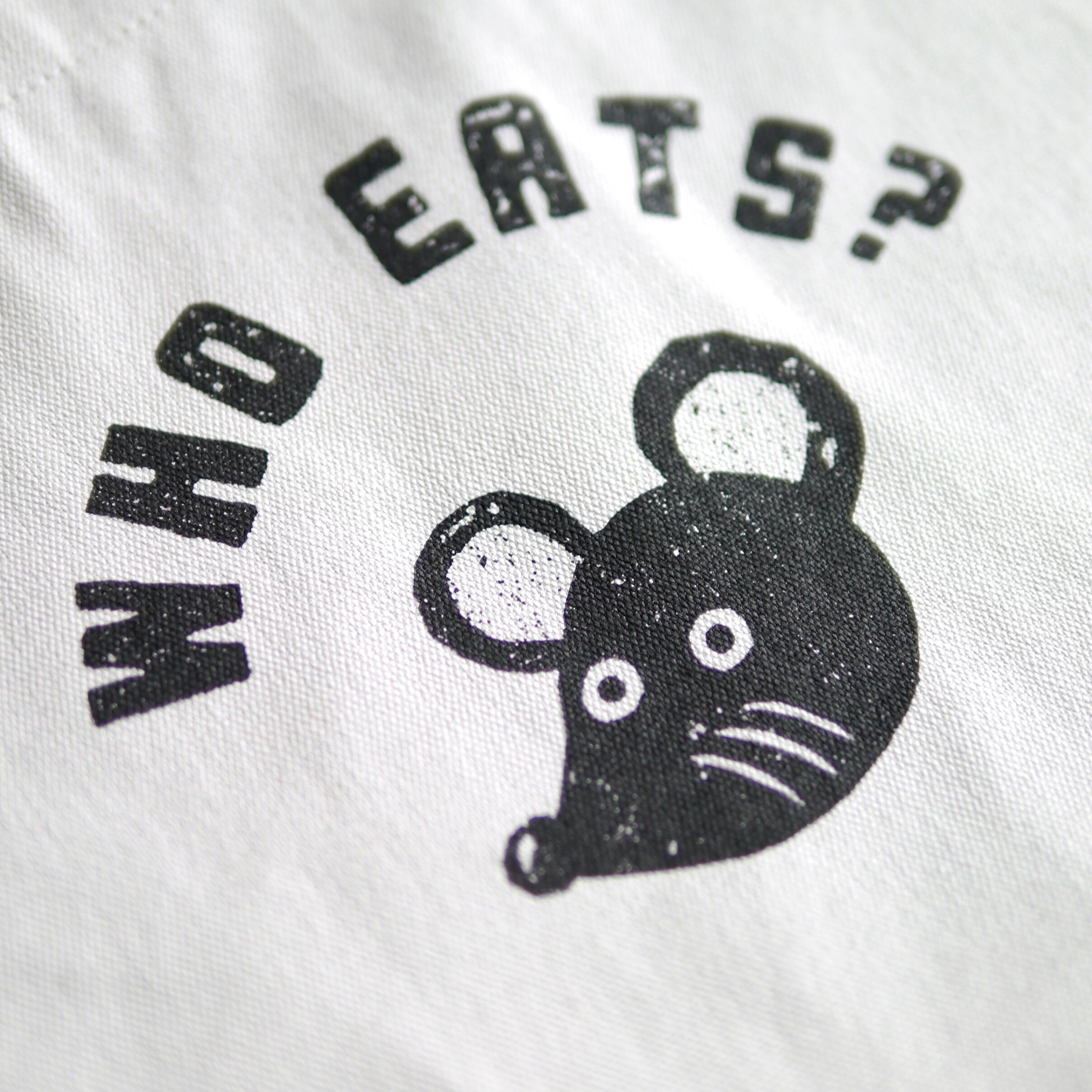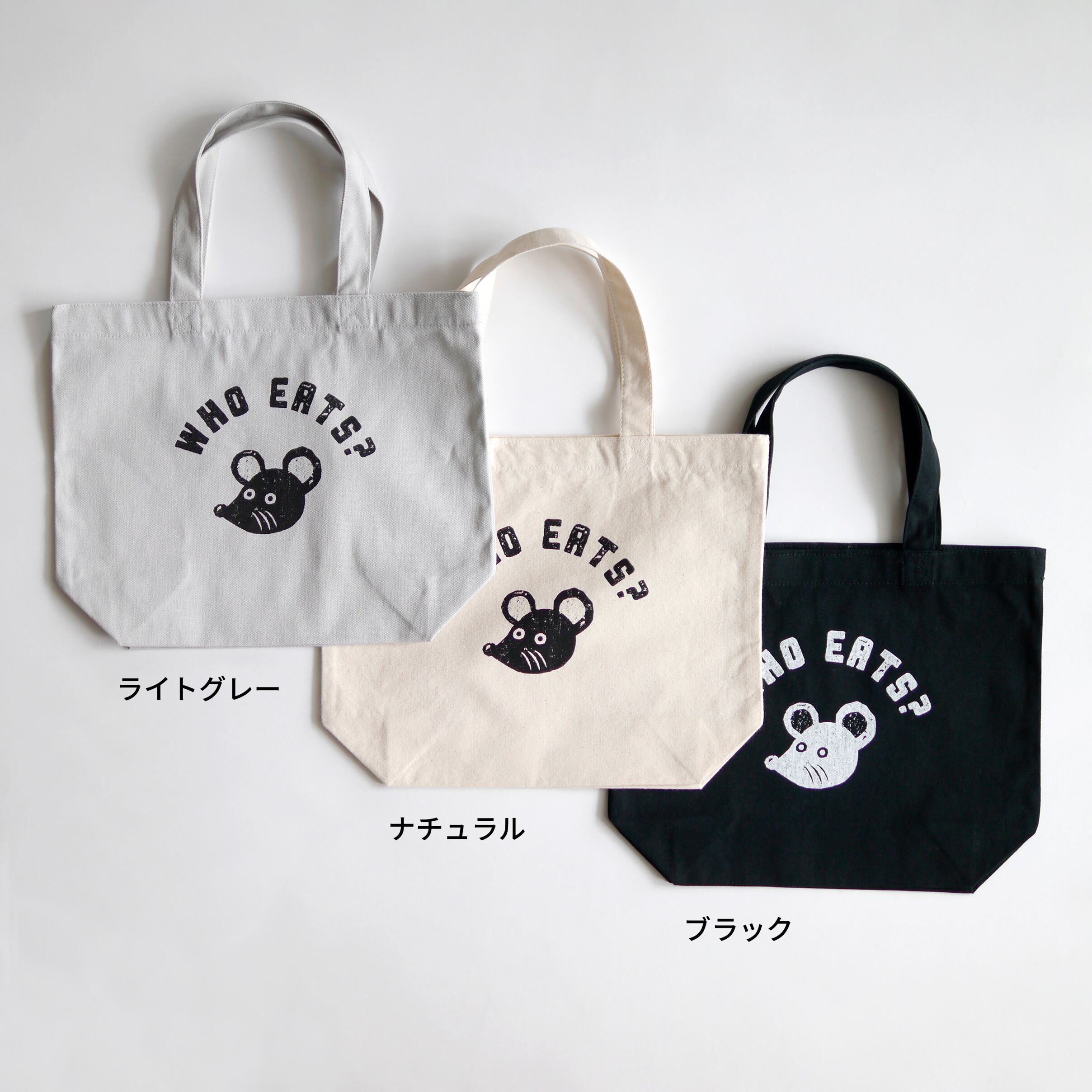 3色から選べるminiトートバッグ。WHO EATS?(たべるのだあれ?)の文字とマスコットの「ねずみ」をプリント。生地の風合いを損ねず古着のような風合いが表現できる半ラバープリントを施した、アパレルライクな仕上がりです。