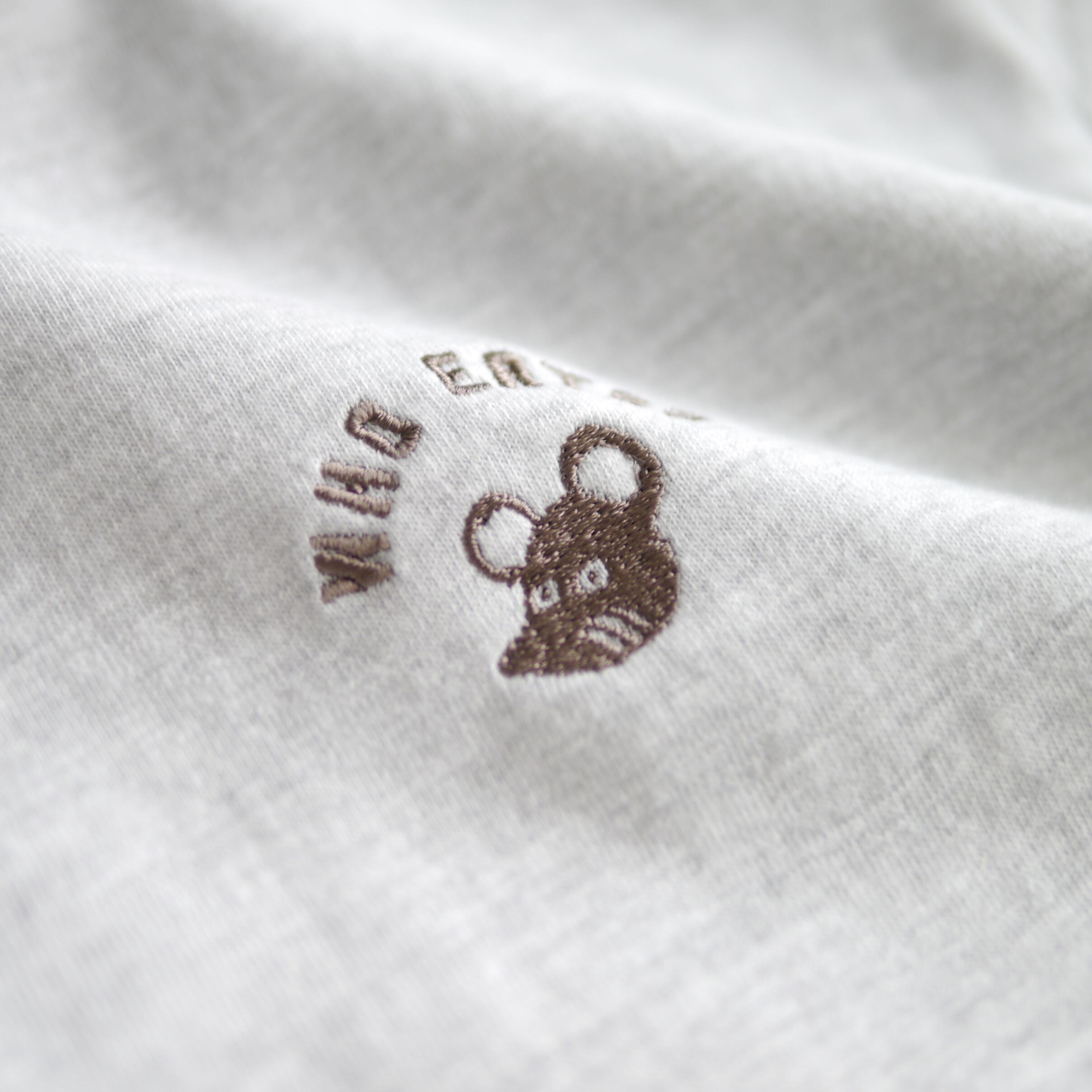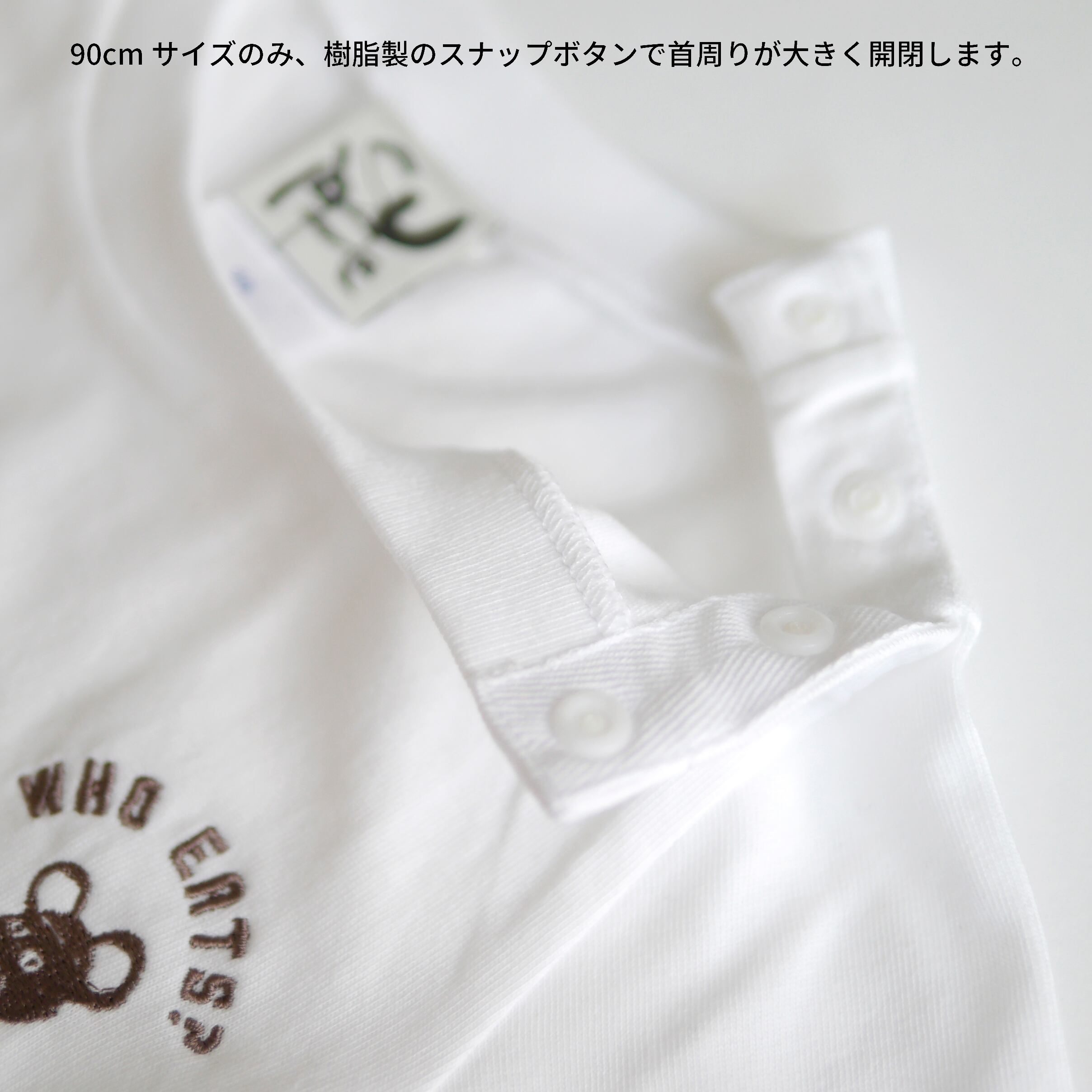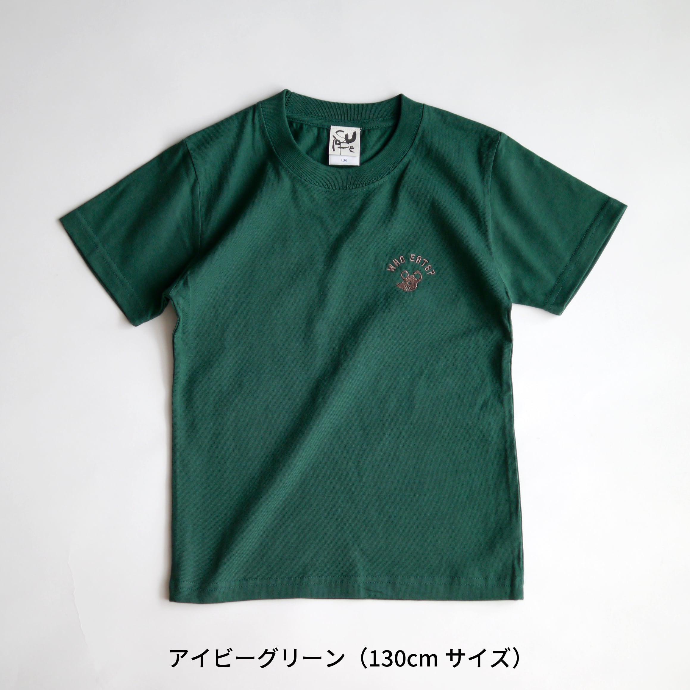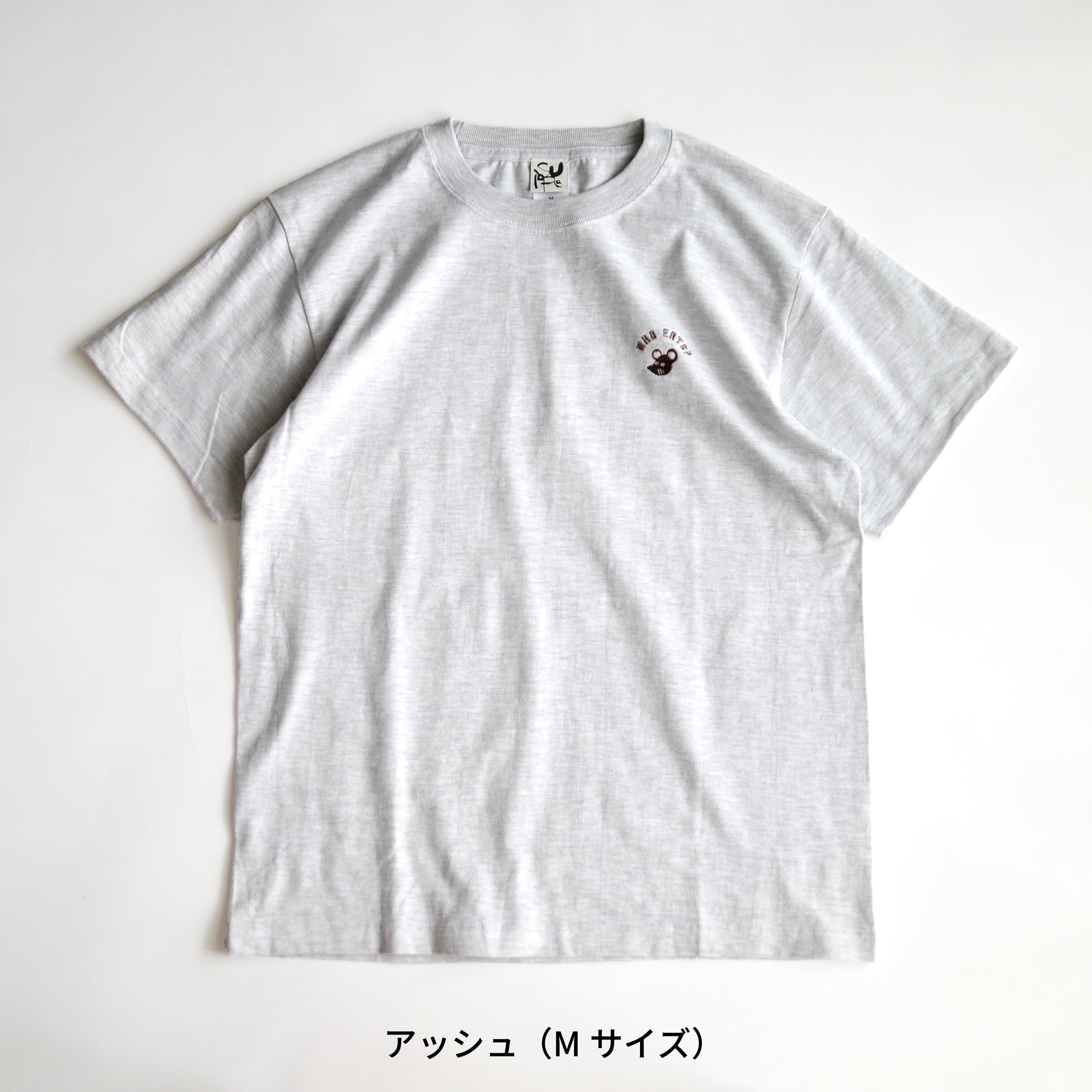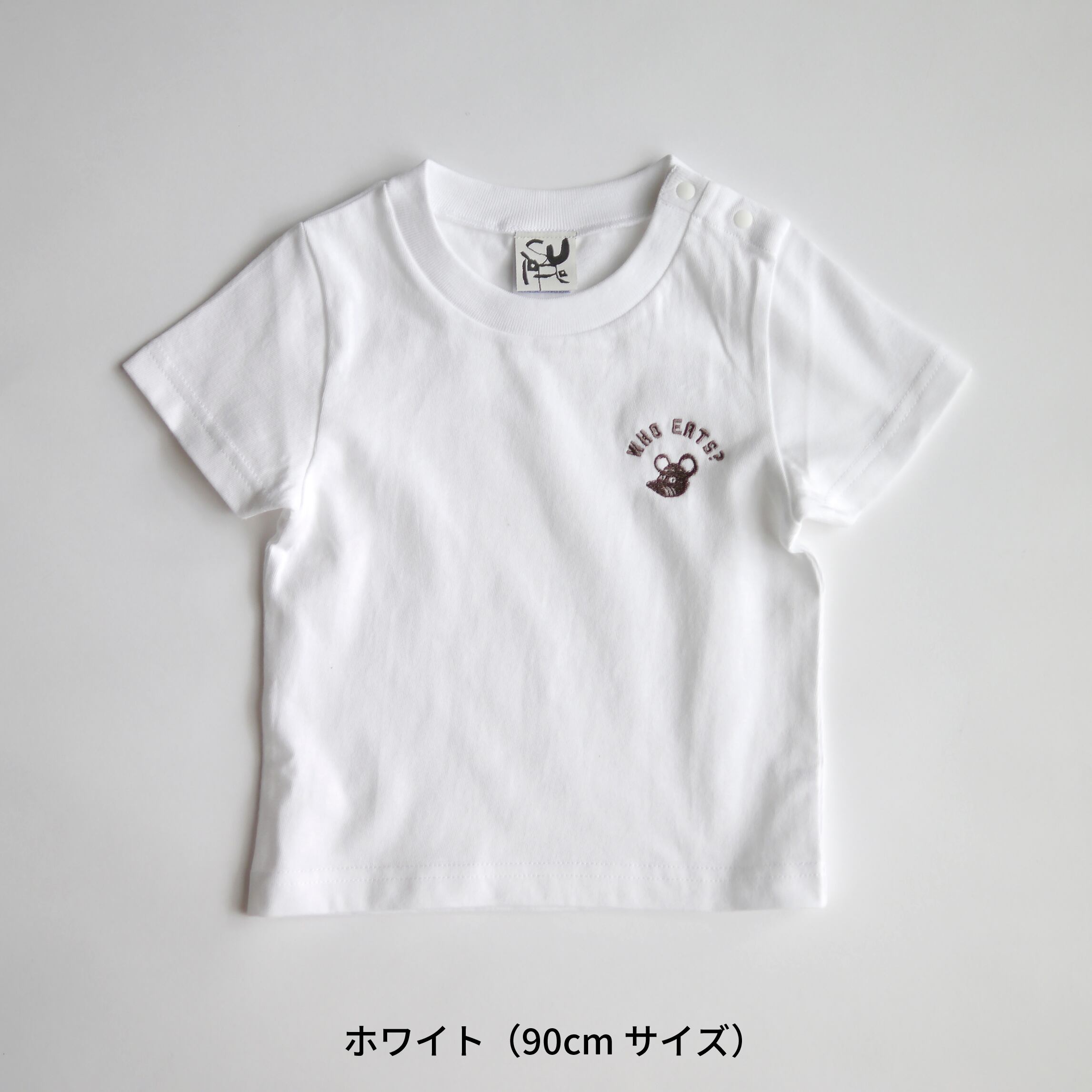 とびだす絵本「たべるのだあれ?」シリーズに登場する、マスコットのねずみと、WHO EATS?(たべるのだあれ?)の文字がワンポイント刺繍されたシンプルなTシャツ。