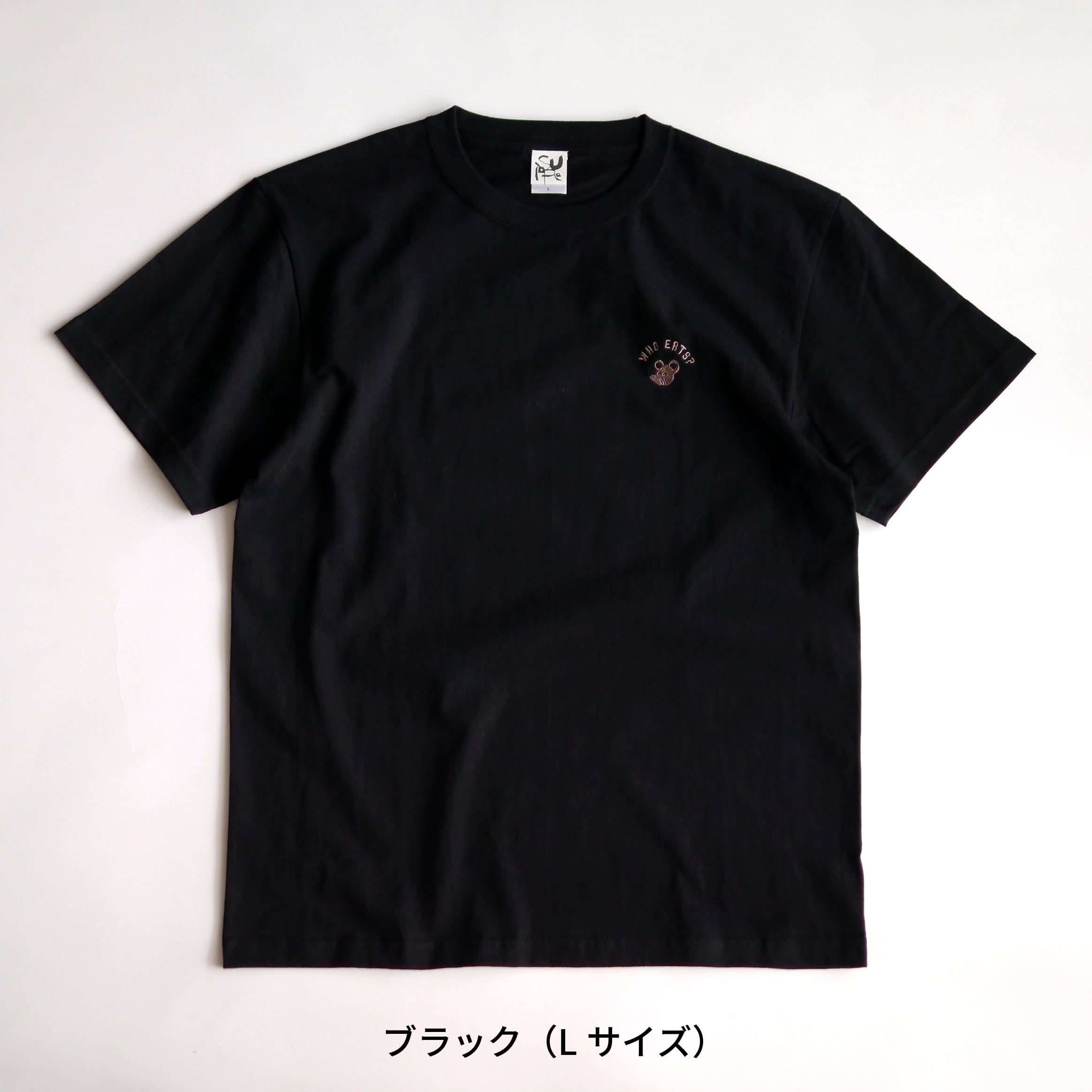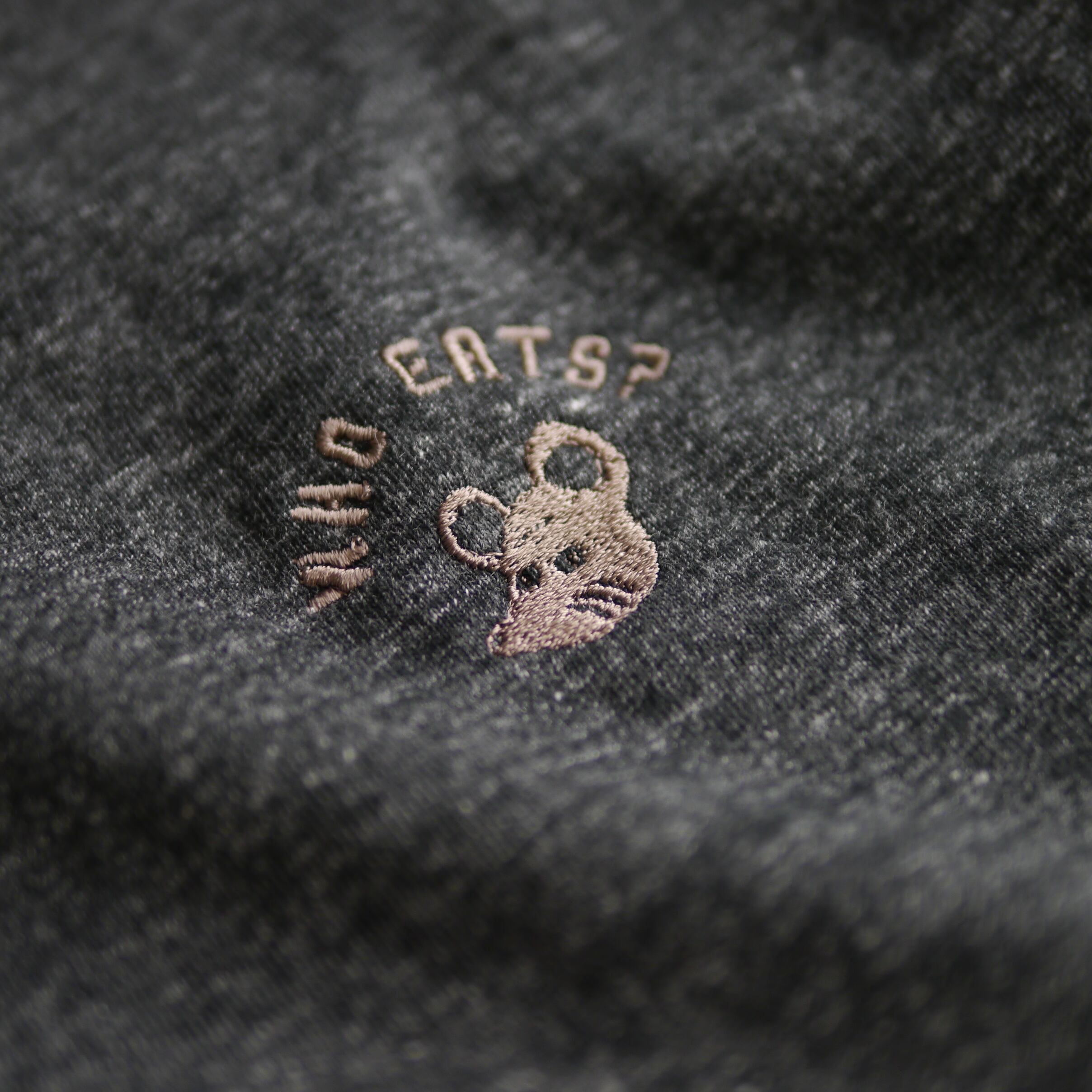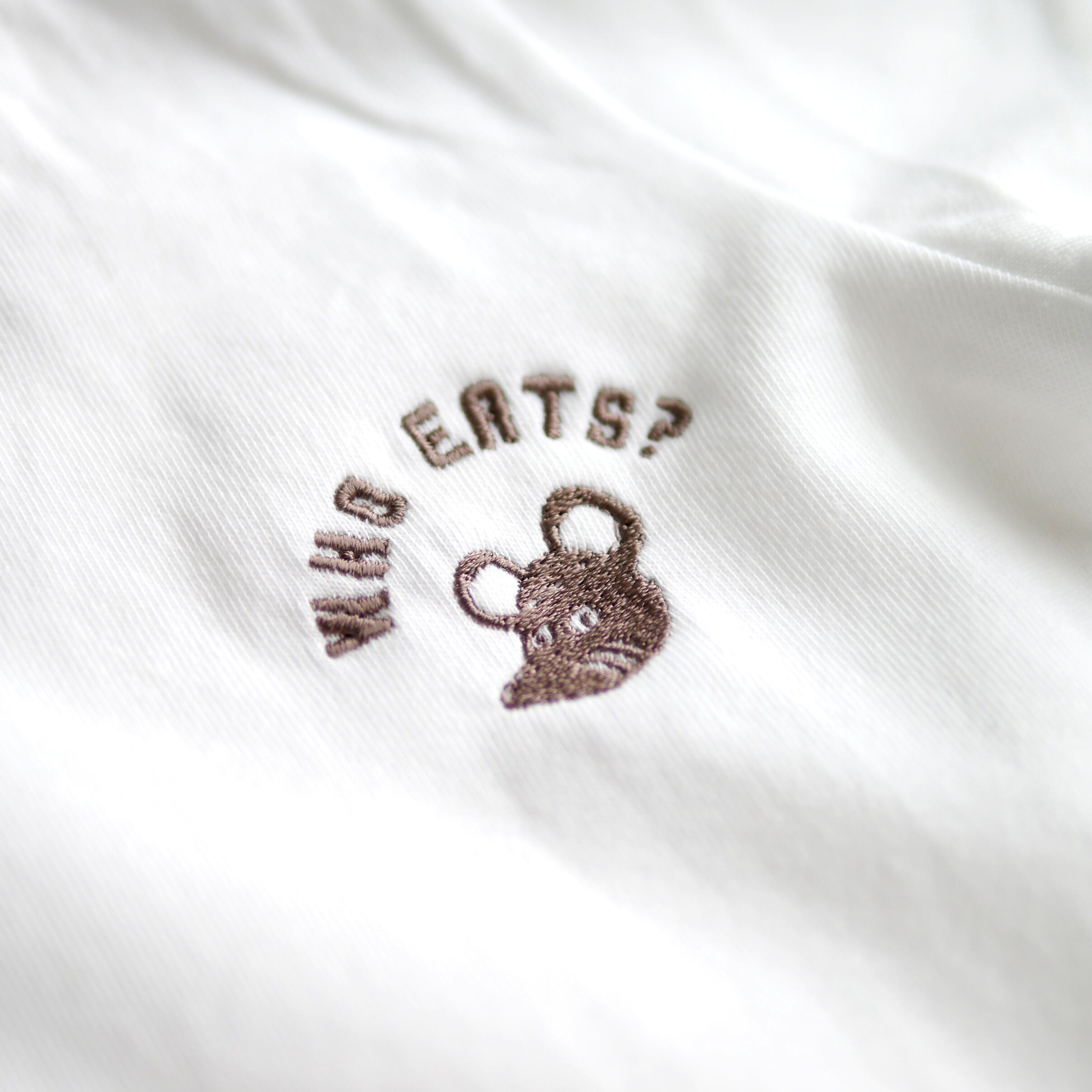 とびだす絵本「たべるのだあれ?」シリーズに登場する、マスコットのねずみと、WHO EATS?(たべるのだあれ?)の文字がワンポイント刺繍されたシンプルなTシャツ。