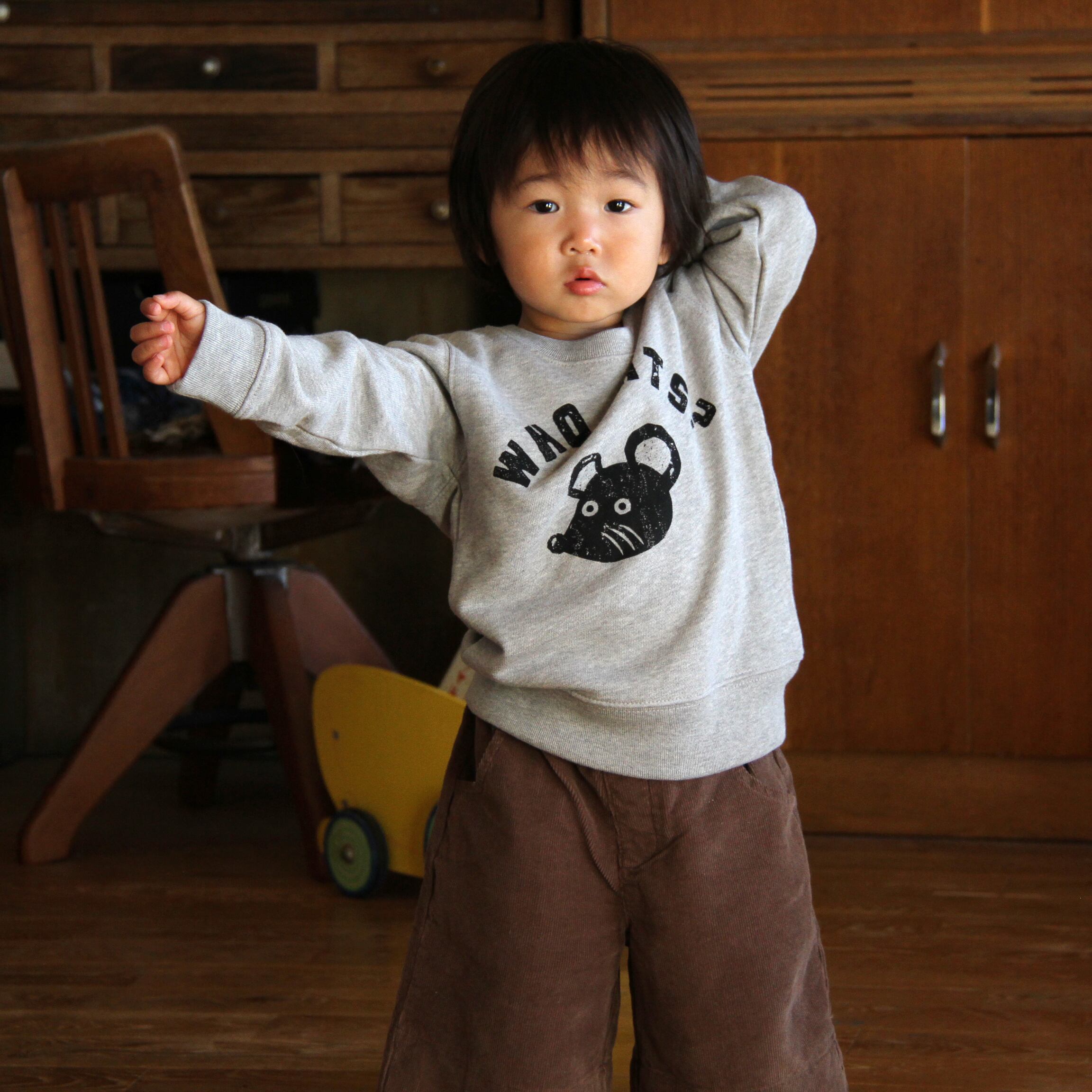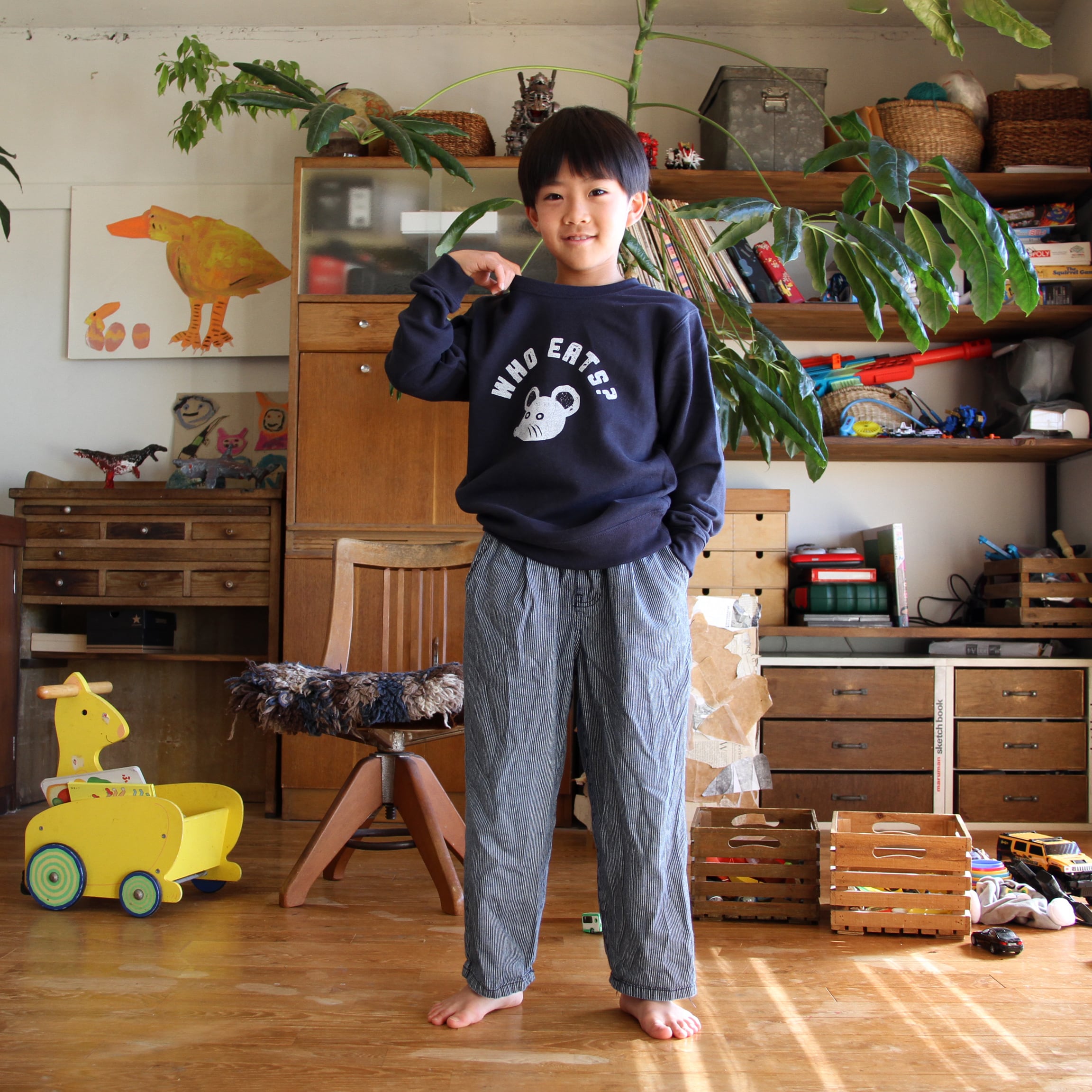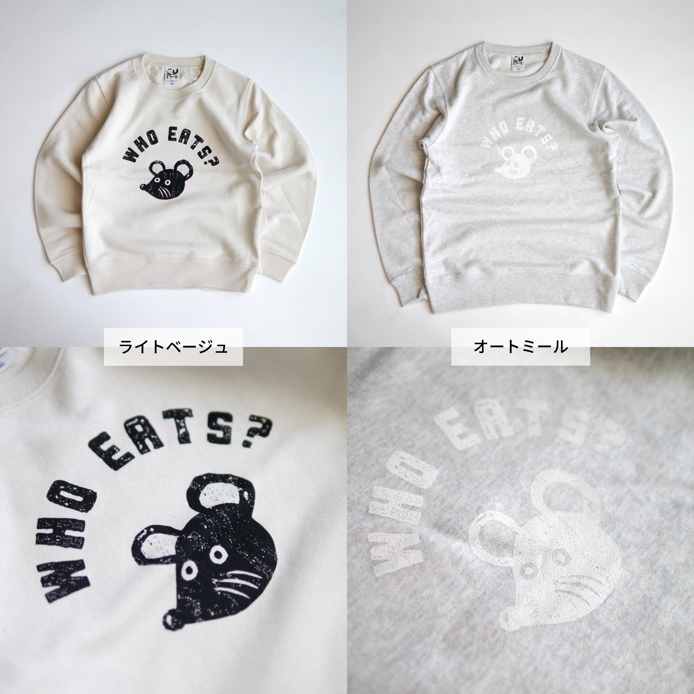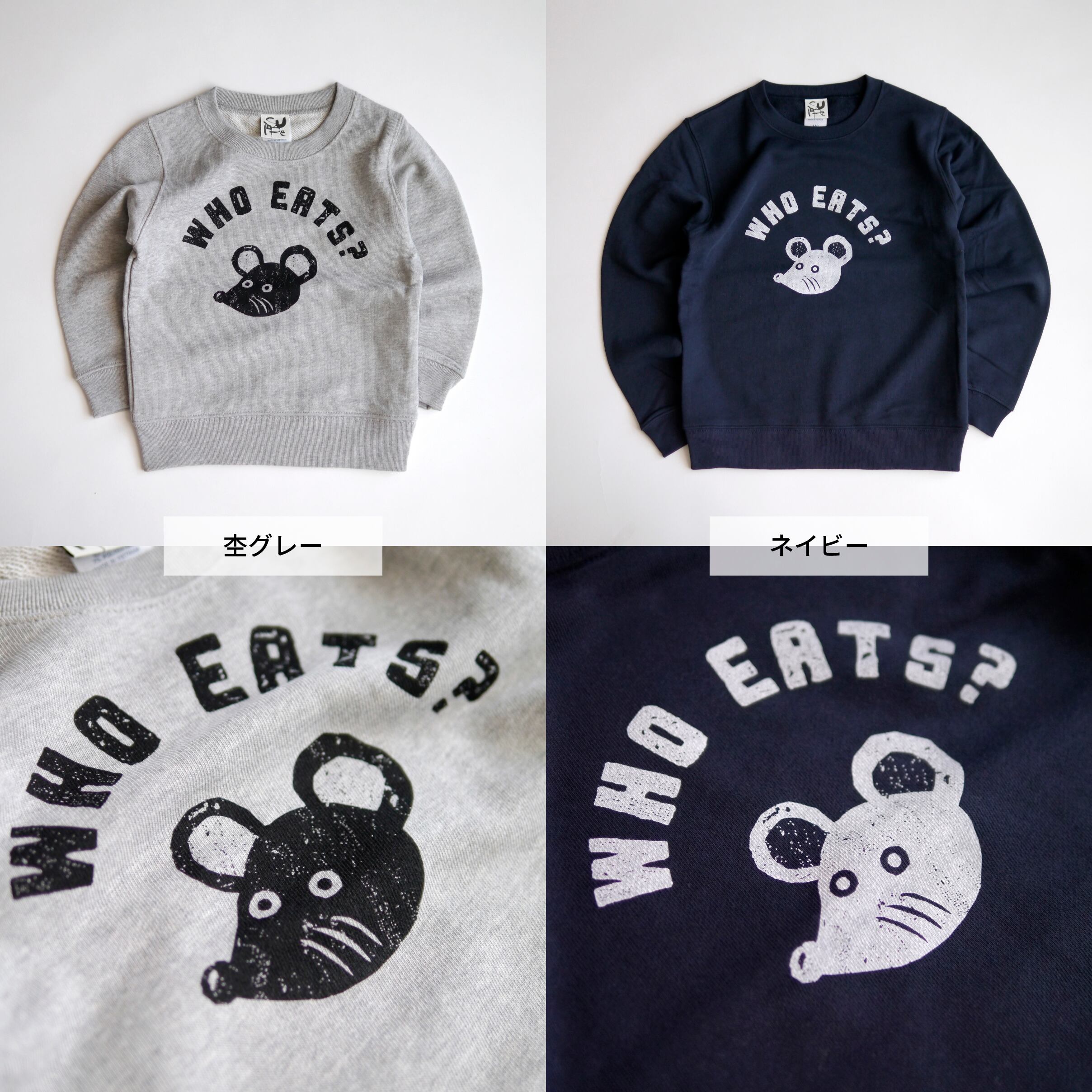 とびだす絵本「たべるのだあれ?」シリーズに登場する、マスコットのねずみと、WHO EATS?(たべるのだあれ?)の文字がデザインされたライトスウェットシャツ。