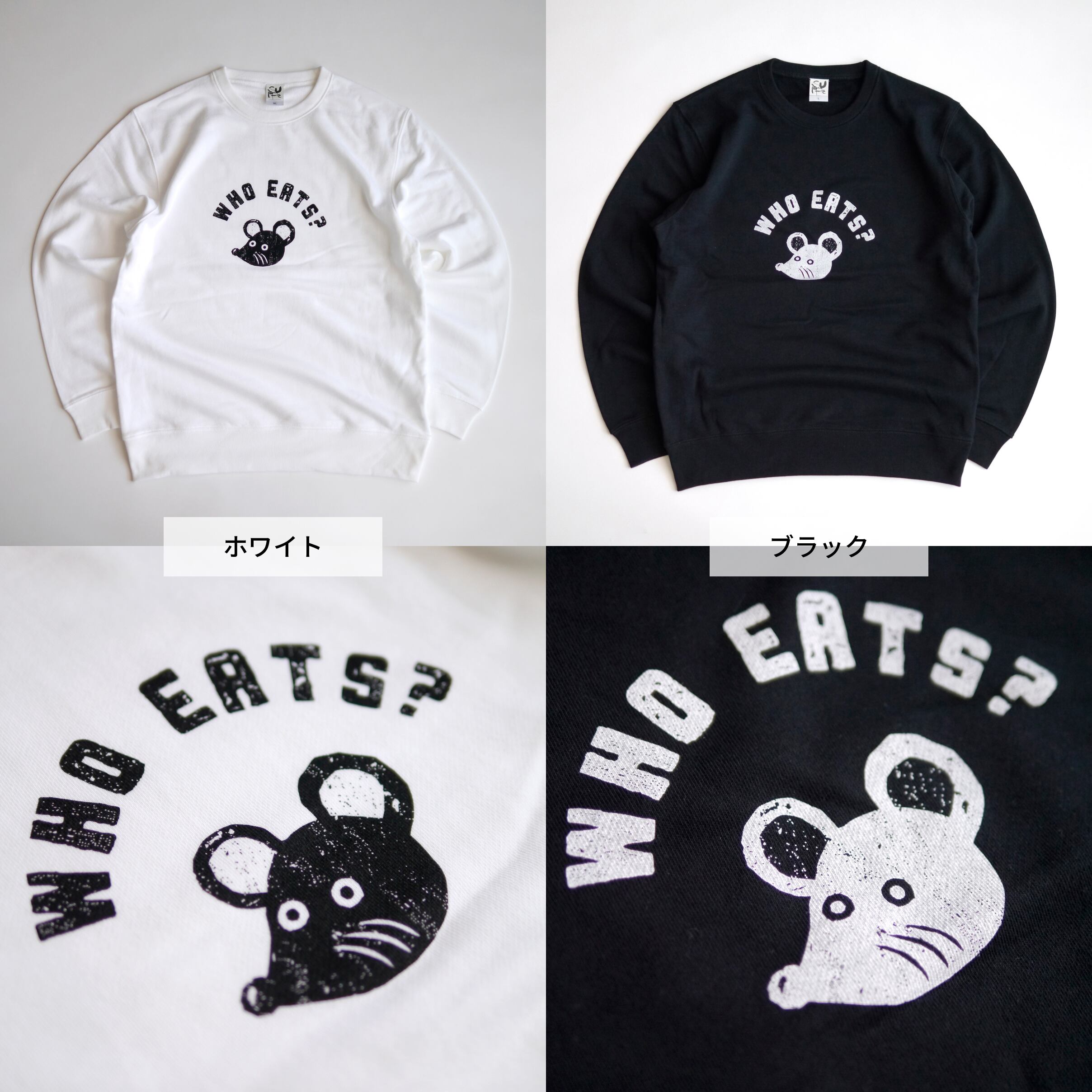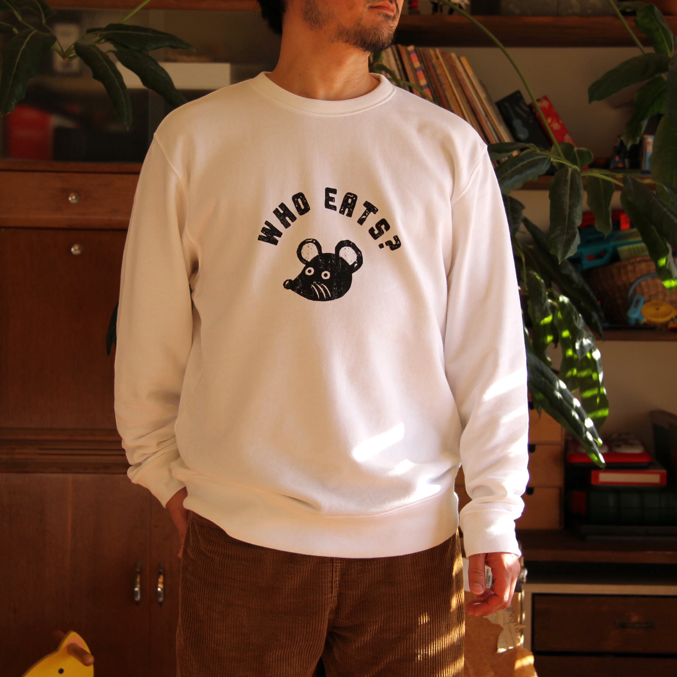 とびだす絵本「たべるのだあれ?」シリーズに登場する、マスコットのねずみと、WHO EATS?(たべるのだあれ?)の文字がデザインされたライトスウェットシャツ。